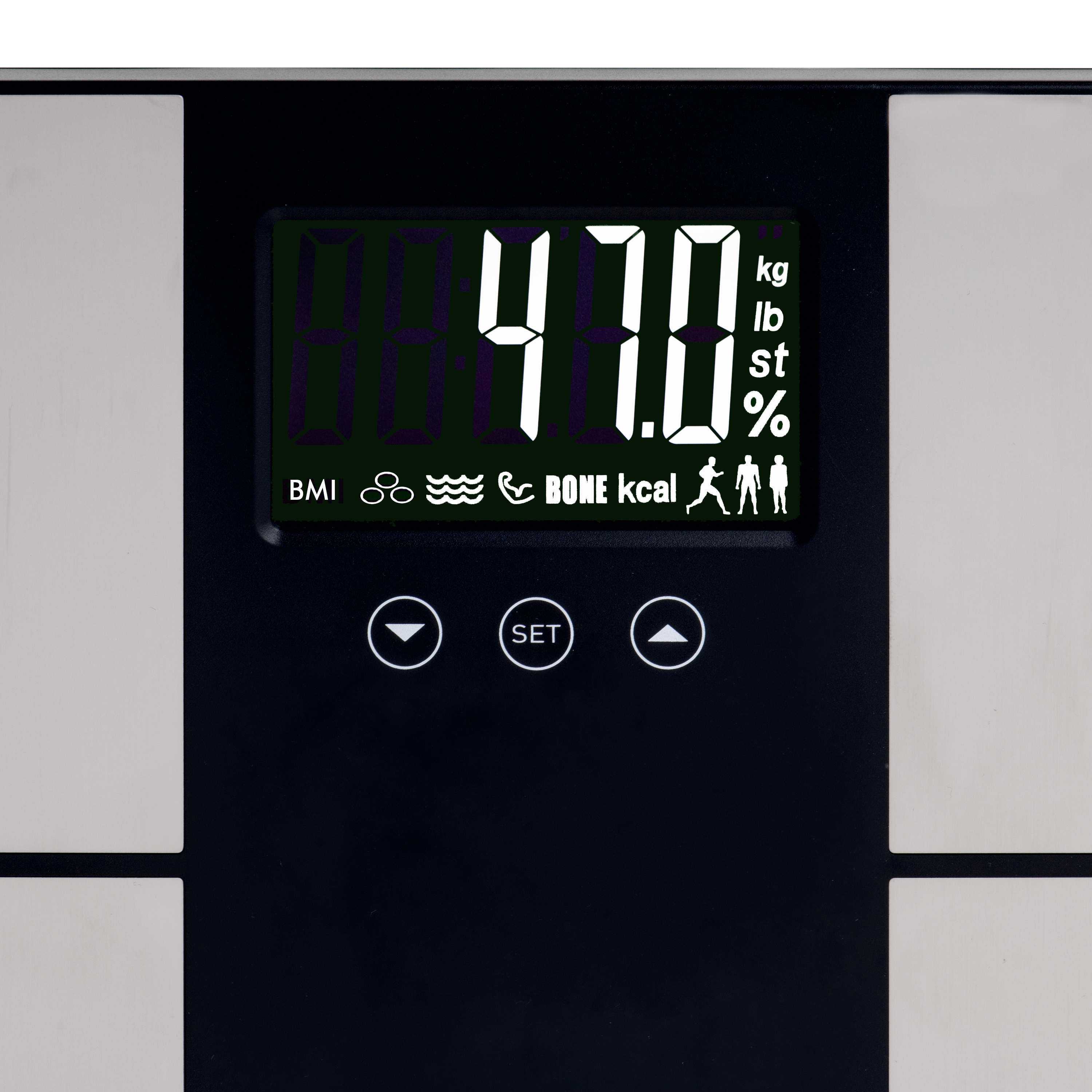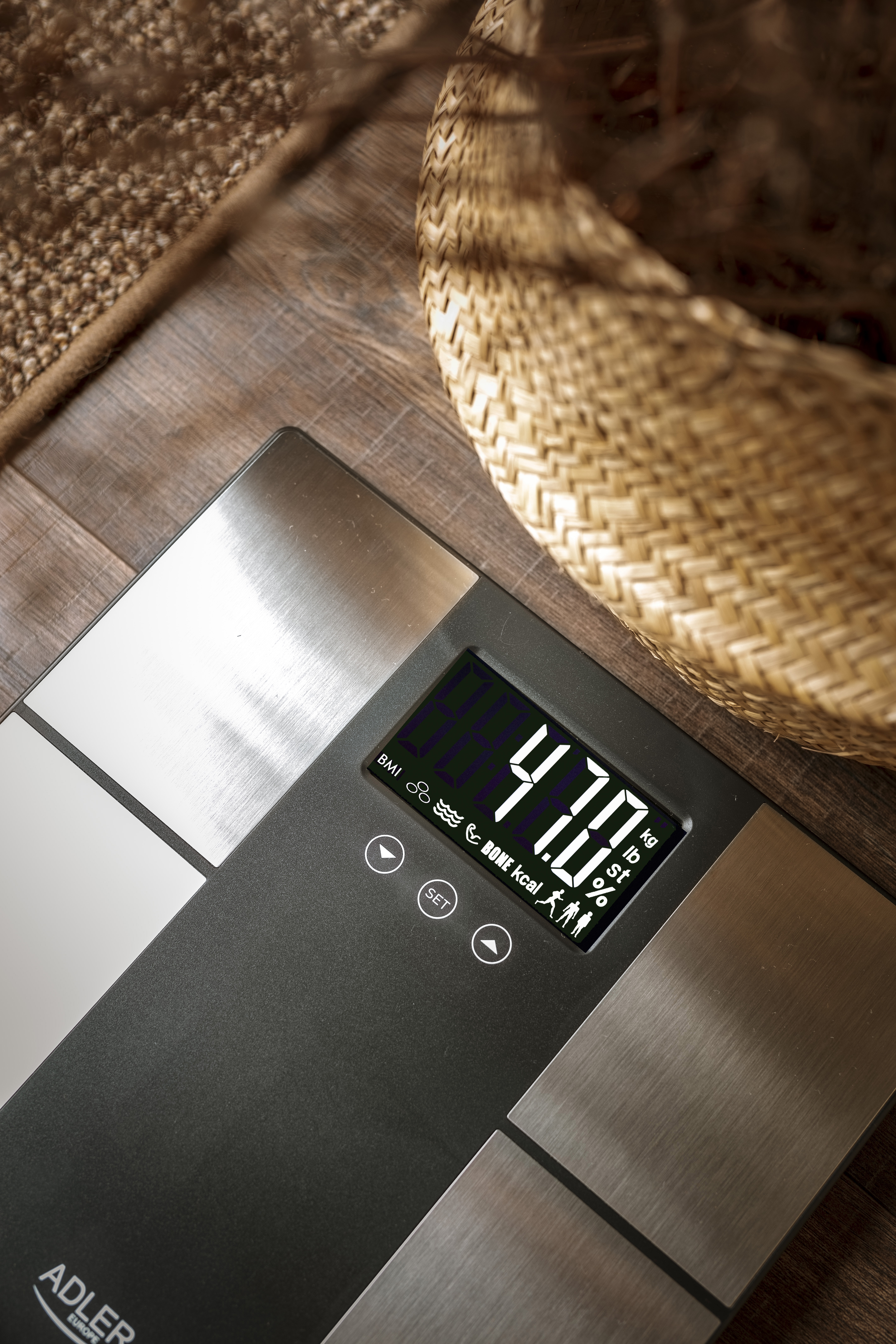 Balança de casa de banho electrónica precisa, com uma capacidade de carga máxima de 225 kg. Uma excelente escolha para atletas, pessoas em dieta e outras pessoas que se preocupam com o seu peso corporal. A medição com alta precisão (100 g) permite uma medição rigorosa. A balança mede: peso corporal,% perda de peso,% hidratação,% massa muscular, aumento de calorias e BMI, ajuda a poupar energia e melhora o conforto. O Painel de leitura permite uma alta legibilidade. Graças à memória de dados para 10 pessoas, o dispositivo pode ser utilizado por toda a família para verificar alterações de peso e BMI.
