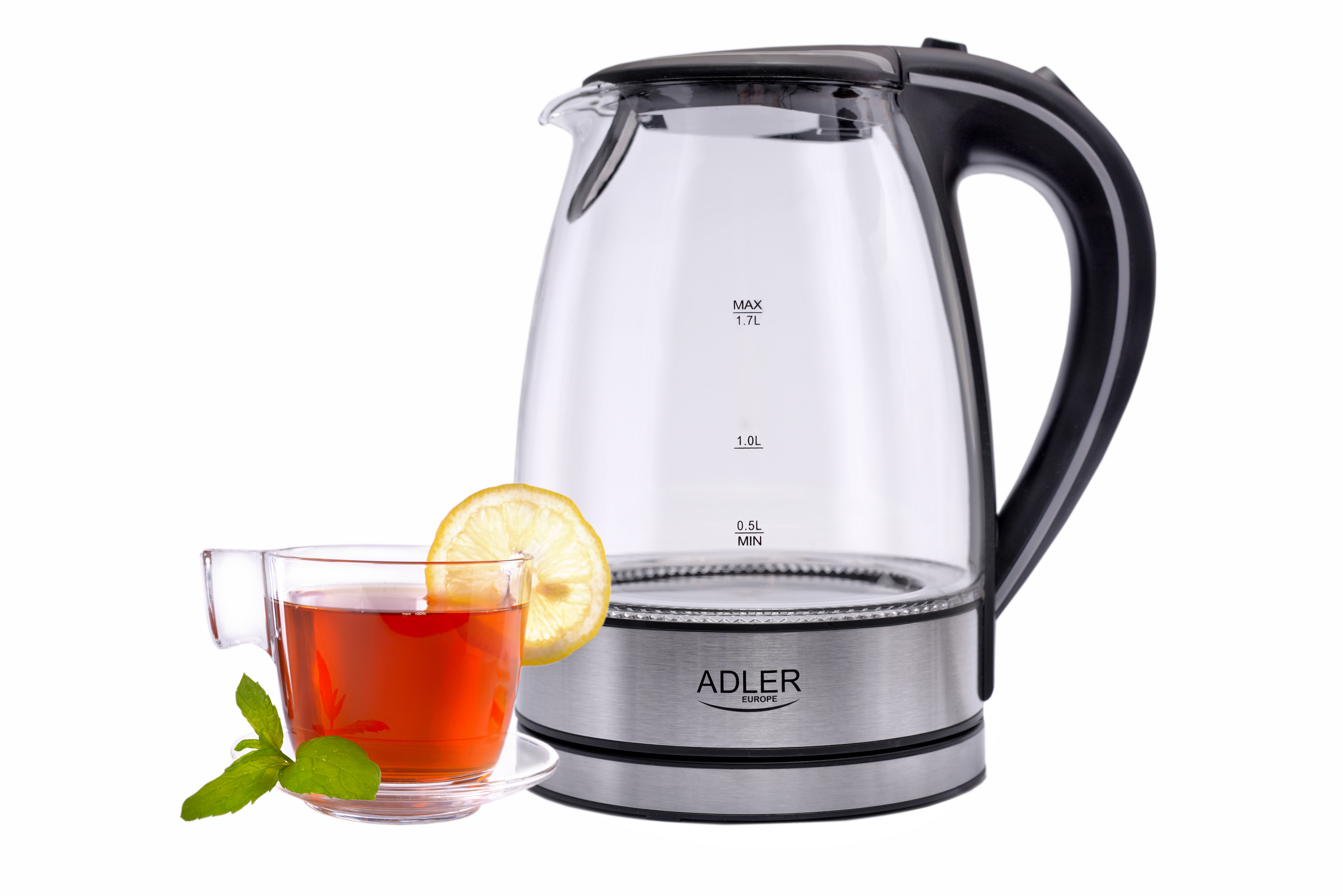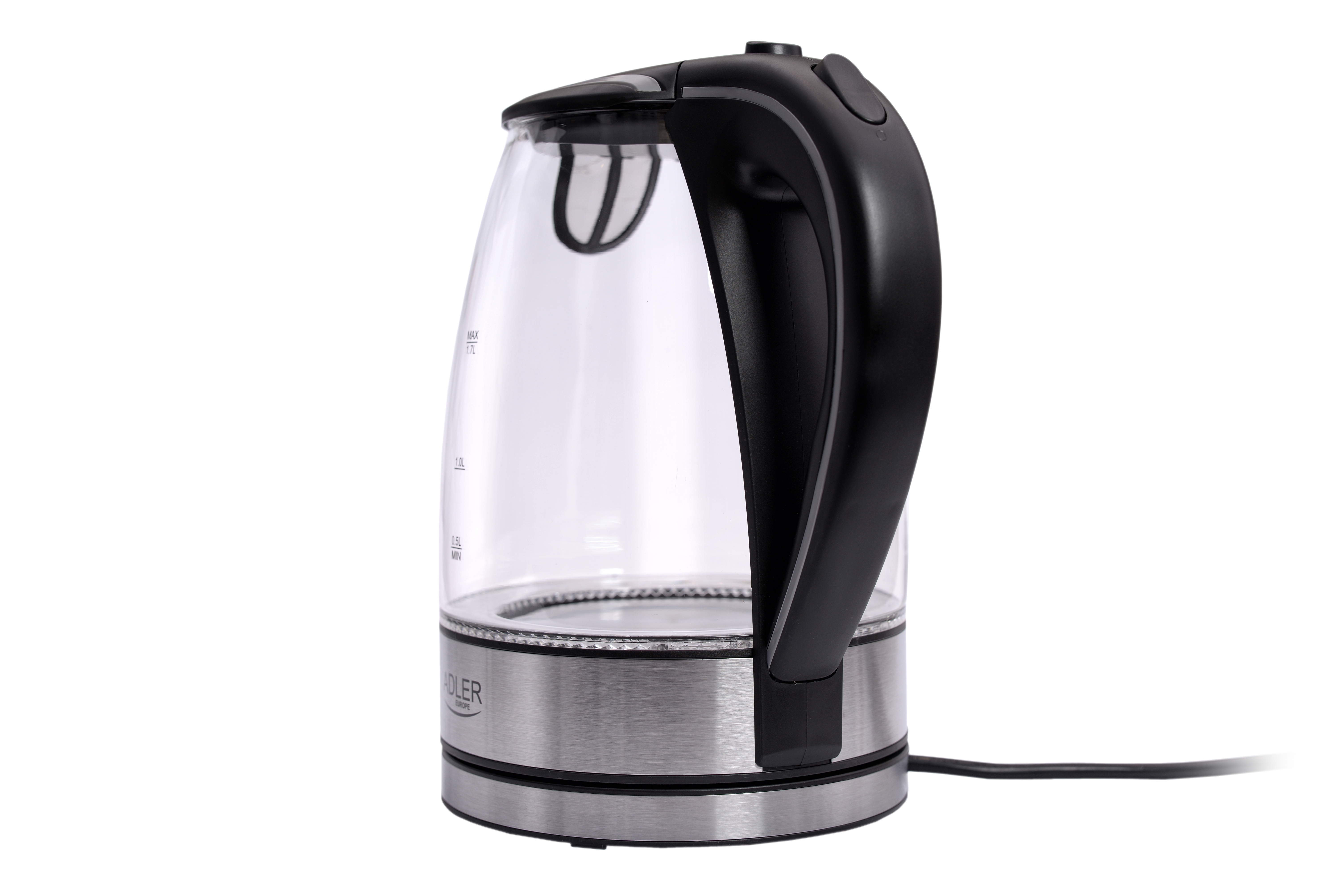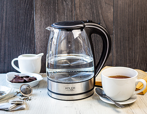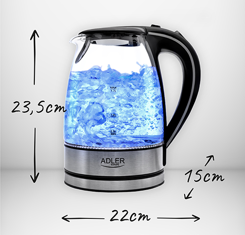 Chaleira elétrica familiar de grande porte, permitindo ferver água para 6-7 pessoas de uma só vez, graças à sua potência de 2200W. Equipada com um indicador claro do nível de água, desliga-se automaticamente após a água ferver. A proteção contra funcionamento a seco impede o funcionamento da chaleira vazia, economizando energia e aumentando a segurança do utilizador. Além disso, um filtro de sedimentos garante a qualidade apropriada da água. Para maior comodidade, possui uma base giratória, base plana, e uma resistência de aço inoxidável, bem como uma luz indicadora de ebulição. O design preto e elegante permite ferver 1,7 litros de água de uma vez.