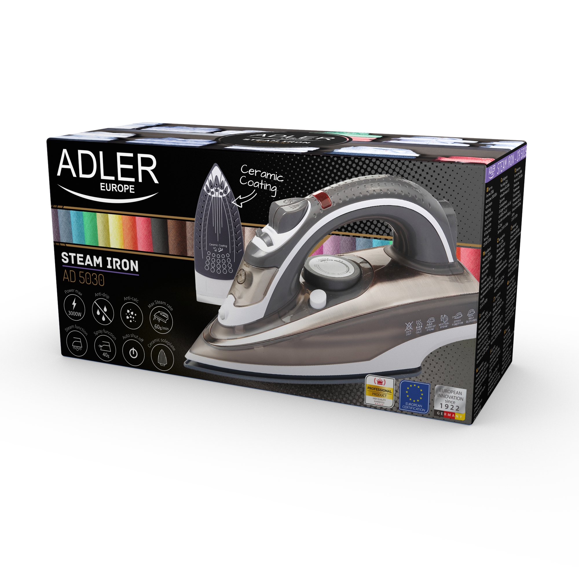 Gosta de engomar e procura equipamento profissional que também ajude a garantir a durabilidade dos tecidos engomados? O ferro cerâmico ADLER AD 5030 é uma solução moderna que surpreenderá mesmo aqueles que não gostam muito de passar a ferro. A funcionalidade, a simplicidade de utilização e o design elegante garantirão a satisfação de qualquer pessoa que tente passar algo com este aparelho! As soluções modernas aqui utilizadas tornarão mais fácil cuidar dos materiais e tecidos não só em casa mas também no local de trabalho. O invólucro de cobre do ferro AD5030 é um invólucro elegante e verdadeiramente potente com 3000 W de potência. Este modelo de base cerâmica está equipado com funções de auto-limpeza, anti-calcário e anti-gotas. A função Spray também está disponível. Grande tanque de água de 310ml e vapor contínuo até 20g / min. permite uma engomagem eficaz.